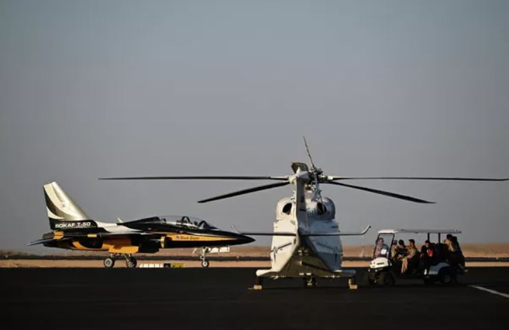 Sân bay của Triển lãm Quốc phòng Thế giới World Defence Show (WDS-2026) ở Riyadh. Bên trái: Máy bay phản lực huấn luyện siêu thanh "T-50 Golden Eagle" của đội bay biểu diễn Không quân Hàn Quốc "Black Eagles". © Sputnik / Pelagiya Tikhonova