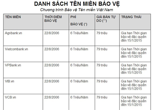 Đáng chú ý, trong danh sách tên miền được rao bán, có 4 ngân hàng là Agribank, Vietcombank, VPBank và VIB. Mức giá bán tự do cho các tên miền .vn này là 79 triệu đồng, hoặc 6 triệu đồng/năm. Theo thông báo, các tên miền này đều đã được đăng ký từ ngày 22/8/2006.