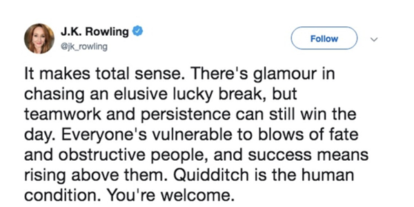 Tác giả của bộ truyện nổi tiếng này, J.K. Rowling mới đây đã đăng lên mạng xã hội một dòng giải thích về ý nghĩa của trò chơi Quidditch.