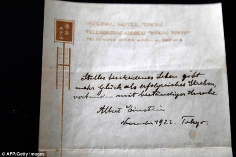 Lời nhắn thiên tài Albert Einstein tặng một người đưa thư ở Tokyo ghi lại ngắn gọn 'công thức' sống hạnh phúc vừa được bán đấu giá ở Jerusalem với giá 1,56 triệu USD (tương đương với gần 35,5 tỷ VNĐ), Dailymail dẫn lời nhà đấu giá cho biết hôm 25/10.