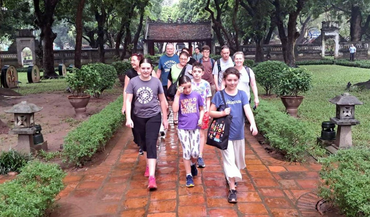 Khách du lịch Nga tham quan Văn Miếu-Quốc Tử Giám. Ảnh: Hoài Nam