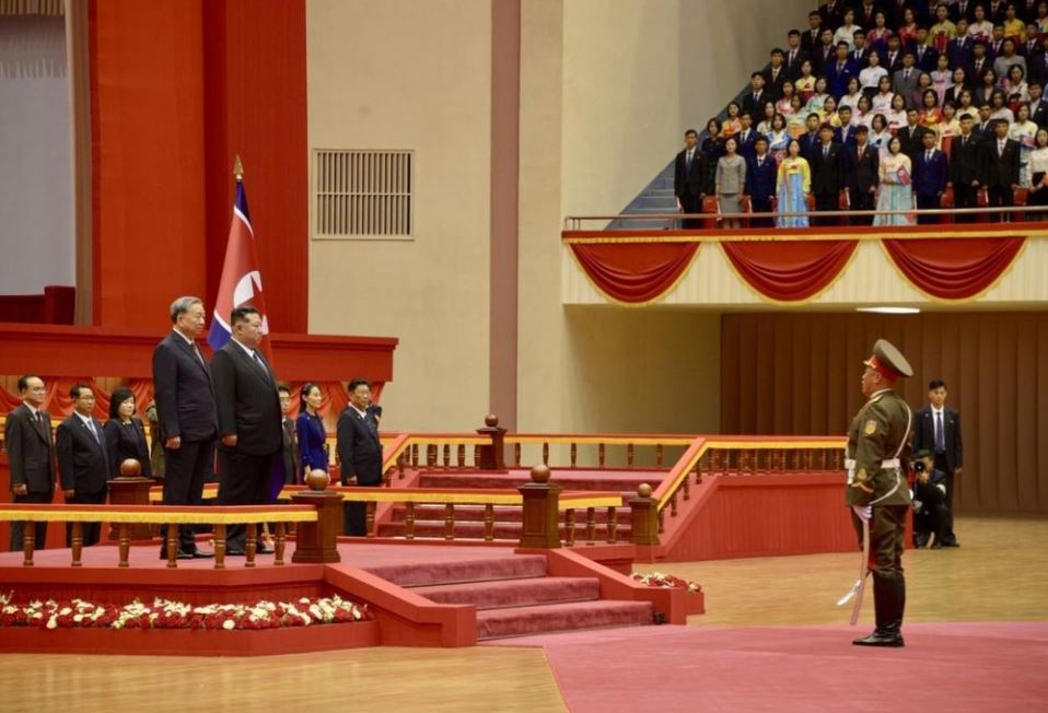 Sáng 9/10 (theo giờ địa phương ) tại Cung Thể thao ở Thủ đô Bình Nhưỡng, Tổng Bí thư Đảng Lao động Triều Tiên, Chủ tịch Quốc vụ nước CHDCND Triều Tiên Kim Jong Un chủ trì lễ đón trọng thể Tổng Bí thư Tô Lâm và Đoàn đại biểu cấp cao nước ta sang thăm cấp Nhà nước tới Triều Tiên.