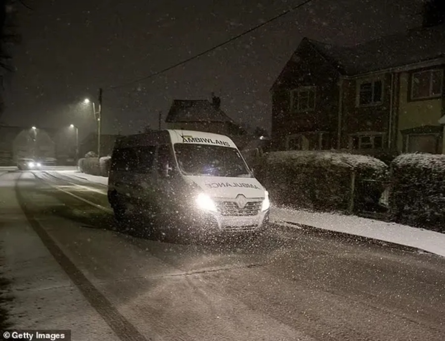 Một chiếc xe cứu thương chạy dưới trời mưa tuyết ở Blackwood, xứ Wales.
