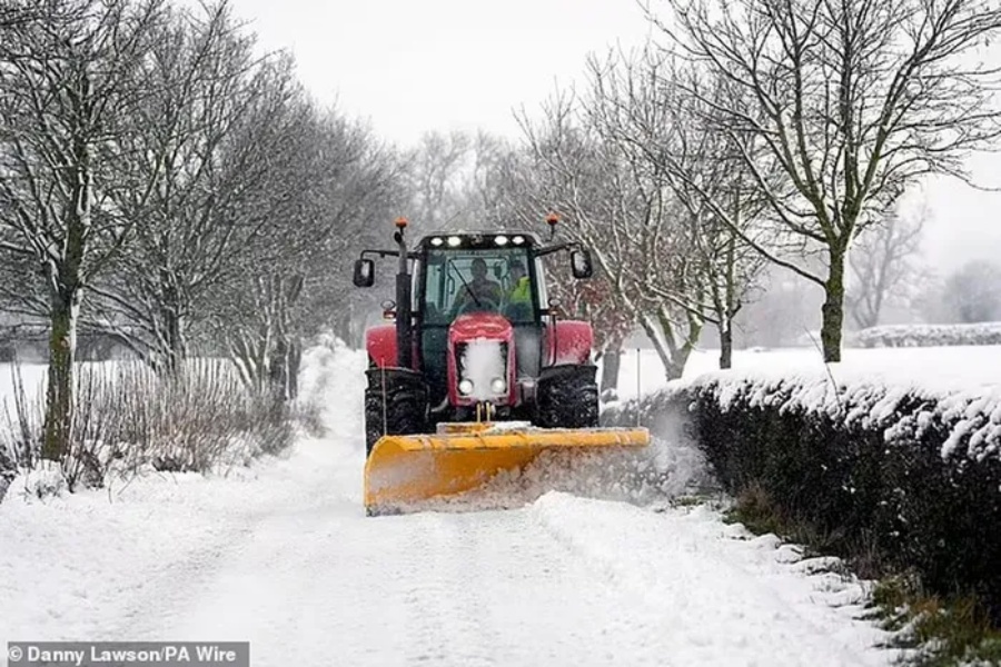 Xe dọn tuyết trên đường ở Scotton, Yorkshire.