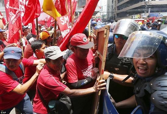 Tại thủ đô Manila, Philippines, hàng trăm công nhân tuần hành yêu cầu được trả mức lương tốt hơn và chấm dứt loại hợp đồng lao động tạm thời. Ảnh: Daily Mail.