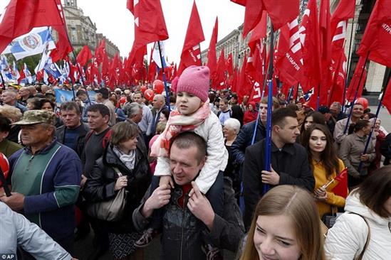 Những người ủng hộ quyền của người lao động cũng xuống đường tuần hành hòa bình trên các con phố ở thủ đô Kiev, Ukraine, mừng Ngày Quốc tế Lao động. Ảnh: Daily Mail.