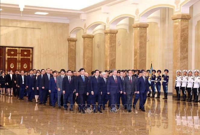 Tổng Bí thư Tô Lâm cùng Đoàn đại biểu cấp cao Việt Nam đến đặt hoa tưởng nhớ Chủ tịch Kim Nhật Thành, Tổng Bí thư Kim Jong-il tại Cung Thái Dương ở Thủ đô Bình Nhưỡng.