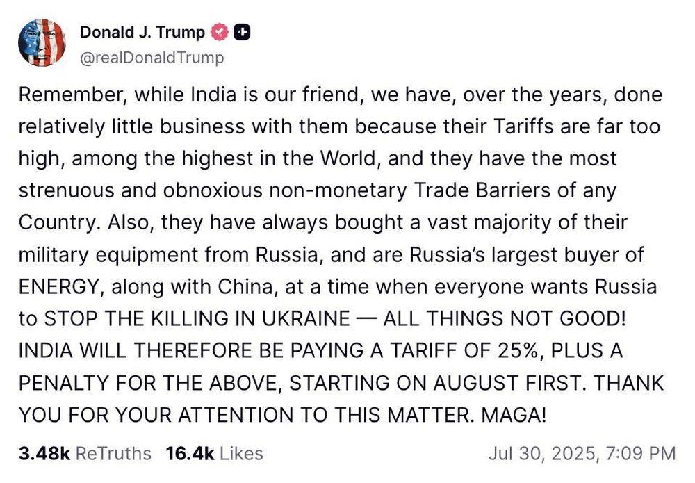 Trong một bài đăng trên mạng xã hội Truth Social hôm thứ Tư (30/7), Tổng thống Trump viết rằng: “Ấn Độ là bạn của chúng ta” nhưng Mỹ “thực hiện rất ít hoạt động kinh doanh với họ” Đồng thời, nhà lãnh đạo Mỹ cũng lưu ý rằng Ấn Độ vẫn tiếp tục mua thiết bị quân sự và năng lượng từ Liên bang Nga giữa lúc cuộc xung đột Ukraine đang diễn ra.