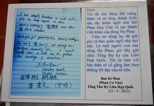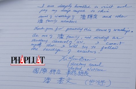 Bản lưu bút được cho là của ông Ban Ki-moon viết tại nhà thờ họ Phan Huy.