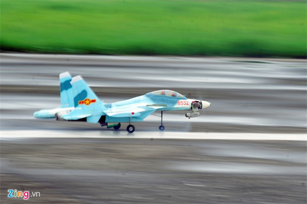 Su30 mô hình trên đường băng, để cất cánh nó phải lăn chừng 30m trước khi rời mặt đất.