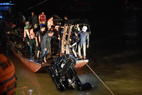 2h50: Chiếc xe gặp nạn được đưa lên bờ thành công, nghi có 2 thi thể mắc kẹt bên trong. Ông Khuất Việt Hùng, Phó Chủ tịch chuyên trách Ủy ban An toàn giao thông Quốc gia xác nhận với báo Trí Thức Trẻ có 2 nạn nhân trên xe gồm 1 nam và 1 nữ đã tử vong, được đưa vào cáng chuyển lên xe cấp cứu.