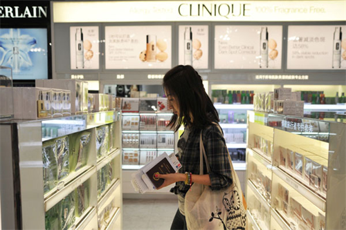 Một phụ nữ đang tìm mỹ phẩm tại một gian hàng miễn thuế.