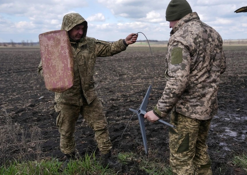 Các binh sĩ thuộc Lữ đoàn Jaeger Độc lập số 68 Oleksa Dovbush của Lực lượng Vũ trang Ukraine thiết lập hệ thống Internet vệ tinh Starlink gần thị trấn tiền tuyến Pokrovsk, vùng Donetsk, Ukraine. Ảnh: Reuters.
