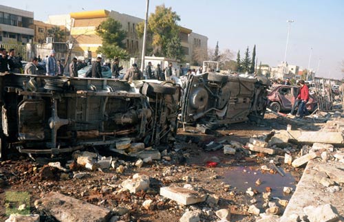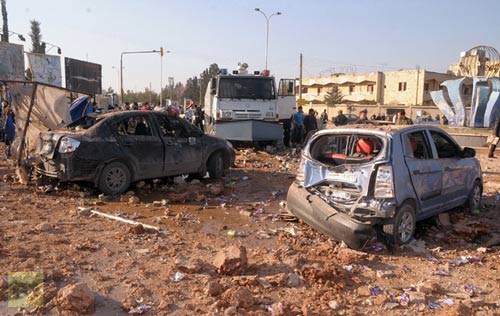Xe ô tô vỡ vụn sau vụ đánh bom hôm qua 15/1 ở Đại học Aleppo.