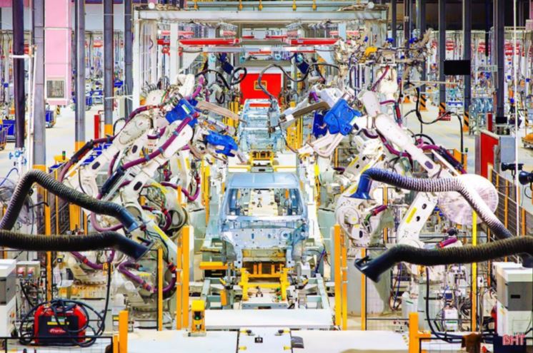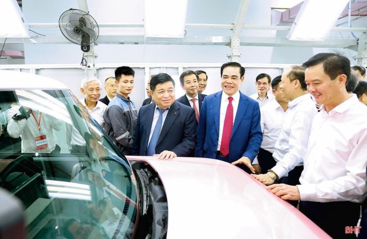 Phó Thủ tướng Chính phủ Nguyễn Chí Dũng và các đồng chí lãnh đạo tỉnh tham quan dây chuyền sản xuất của Nhà máy Sản xuất ô tô điện VinFast Hà Tĩnh (ngày 29/6/2025).