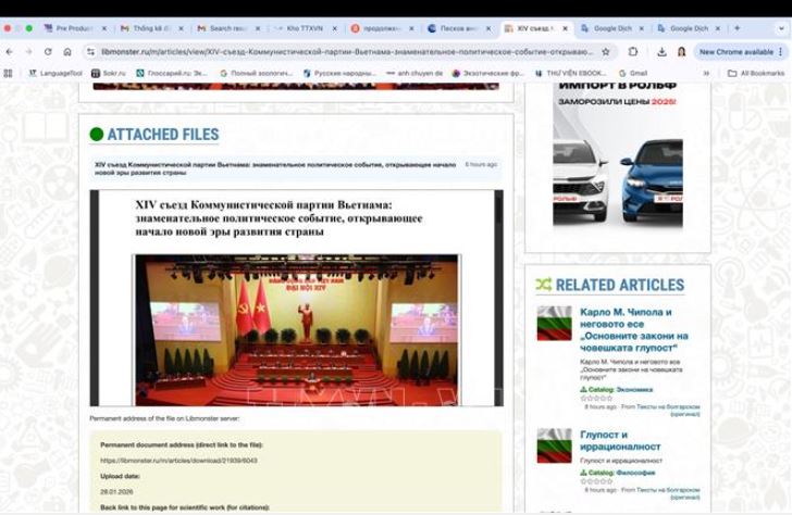 Theo phóng viên TTXVN tại Moskva, ngày 28/1, trang thư viện số quốc tế https://libmonster.net đăng tải bài viết của Trưởng ban Ban Thông tin, Viện Kinh tế thuộc Viện Hàn lâm khoa học Nga, Vyacheslav Ivanovic Grachev, điểm lại những kết quả quan trọng nhất của Đại hội Đại biểu toàn quốc lần thứ XIV (Đại hội XIV) của Đảng Cộng sản Việt Nam, đánh giá đại hội có ý nghĩa bước ngoặt chiến lược đối với sự nghiệp phát triển của Việt Nam.
