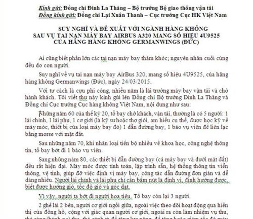Theo dõi thông tin về thảm họa hàng không Germanwings (Đức) xảy ra hôm 24/3/2015 vừa qua, ông Mai Trong Tuấn - một cựu phi công với nhiều năm là lái trưởng máy bay vận tải, hành khách vừa viết lá thư gửi đến Bộ trưởng Bộ Giao thông vận tải Đinh La Thăng và Cục trưởng Cục Hàng không Việt Nam.