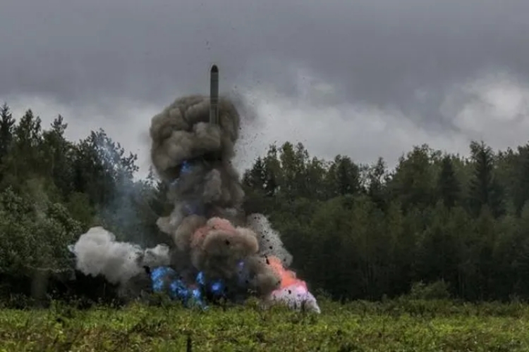 Khoảnh khắc một tên lửa của Nga được khai hỏa trong tập trận. Ảnh: GettyImages