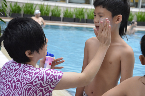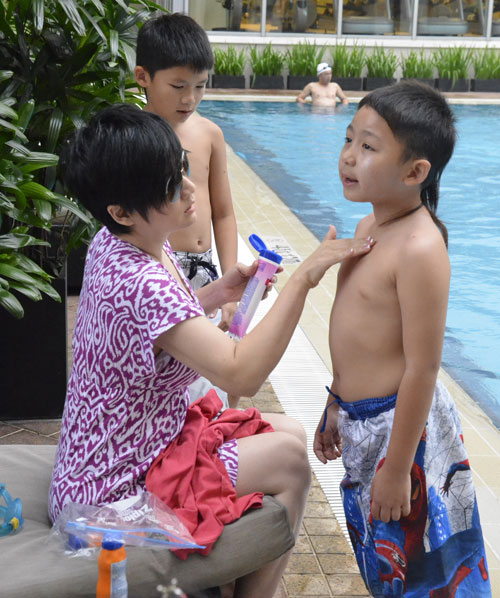 Vắng chồng, vợ Bằng Kiều đưa con đi bơi