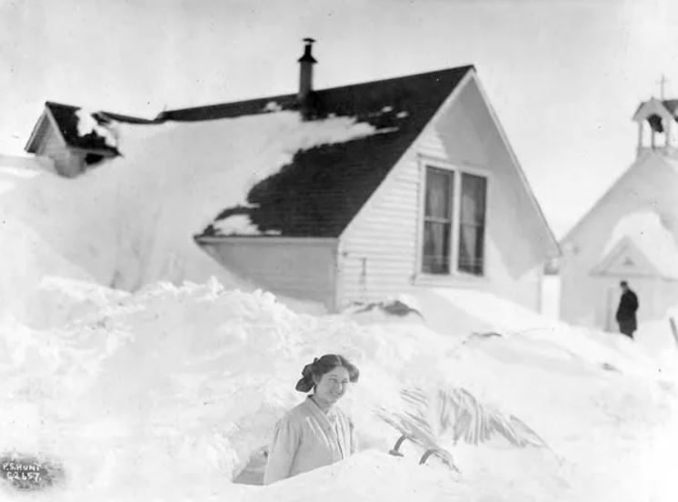 Một phụ nữ lội qua đống tuyết chất cao sau trận bão tuyết tại Valdez, Alaska. © Ảnh : Public domain/Phinney S. Hunt