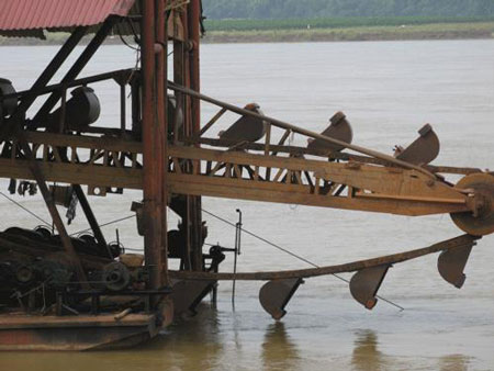 Những gàu múc đất, cát lẫn vàng được thả xuống sông sâu cả chục mét, sau đó đưa lên thuyền lọc lấy vàng