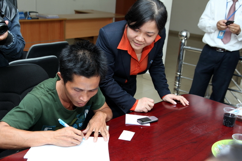 Nhân viên ngân hàng hỗ trợ anh Hậu làm thủ tục yêu cầu chuyển tiền cho các tài khoản đã hỗ trợ anh trong thời gian qua - Ảnh: Độc Lập