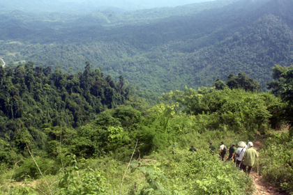 Vượt qua quãng đường 50 km, qua ngã 3 Nghinh Tường - Sảng Mộc, ông Dương Ngọc Long quyết định sẽ đi theo cung đường mà PV Dân trí đã từng qua để xâm nhập “bãi chiến trường” của lâm tặc trong rừng già. Chuyến đi bắt đầu bằng việc cuốc bộ từ chân núi Nà Leng. Hơn 30 người trong đoàn gồm lãnh đạo UBND tỉnh, Sở NN&PTNT, Chi cục Kiểm lâm, Công an tỉnh, bộ đội, UBND huyện Võ Nhai... vượt qua những đoạn núi dốc đứng, nơi còn hằn rõ những đường đi của gỗ.