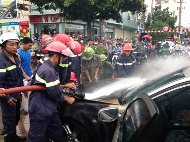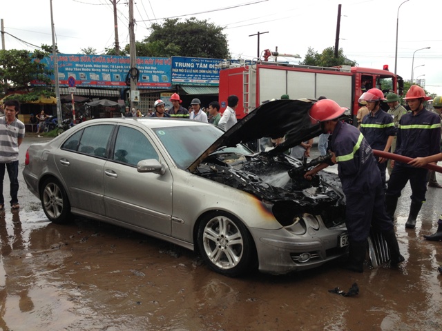 Khoảng hơn 10 phút sau, 4 xe cứu hỏa cùng hàng chục cán bộ, chiến sĩ Phòng Cảnh sát PCCC quận 2 đã có mặt tại hiện trường và phá nắp capo phun nước khống chế ngọn lửa. Tuy nhiên, toàn bộ phần máy và phía trước đầu xe đã bị cháy rụi hư hại hoàn toàn.