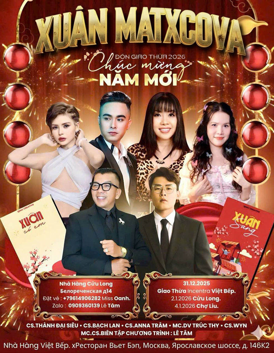 Chỉ còn 15 ngày nữa, không khí đón chào năm mới tại Mátxcơva sẽ trở nên sôi động hơn bao giờ hết với chương trình nghệ thuật đặc biệt mang tên “Xuân Mátxcơva 2026 – Đón Giao thừa & Chúc mừng Năm mới”. Đây là chuỗi sự kiện âm nhạc quy mô, được tổ chức trong ba đêm liên tiếp, hứa hẹn mang đến cho cộng đồng người Việt tại Nga một mùa xuân ấm áp, rộn ràng và giàu cảm xúc.
