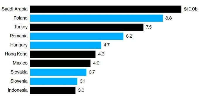Cụ thể, theo dữ liệu do Bloomberg tổng hợp, các chính phủ ở Đông Âu đã vay gần 32 tỷ USD chỉ trong mấy tháng từ đầu năm tới nay, gấp ba lần số tiền so với cùng kỳ năm ngoái. Lần đầu tiên sau hàng chục năm, ba quốc gia Đông Âu là Ba Lan (9 tỷ USD), Romania (6 tỷ USD) và Hungary (5 tỷ USD) nằm trong danh sách 5 thị trường mới nổi vay tiền hàng đầu ở nước ngoài.