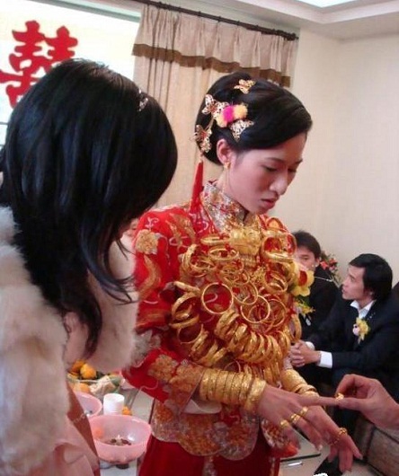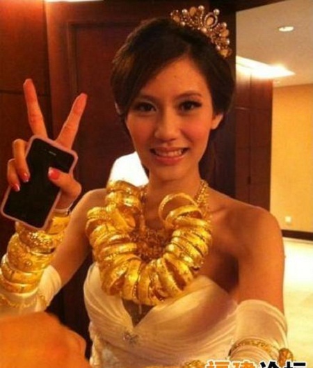 Trong số các cô dâu Châu Á, cô dâu Trung Quốc hiện nay là “chịu chơi” nhất. Những mốt mới như đeo miện đội đầu bằng vàng đã bắt đầu quay trở lại. Xưa kia chỉ con nhà đại quan mới có được diễm phúc ấy. Cô dâu Trung Quốc cũng thường xuyên được xuất hiện trên mặt báo với những tiêu đề kiểu như “Cô dâu gãy cổ vì vàng”. Đó chỉ là những tiêu đề hài hước nhưng phản ánh một hiện tượng có thật đang ngày càng phổ biến trong những gia đình khá giả ở Trung Quốc. Đối với họ, tặng cho cô dâu một chiếc lắc hay dây chuyền vàng nhân ngày trọng đại chẳng có gì đáng tiếc. Thế là không chỉ bố mẹ mà cả những vị quan khách giàu có cũng tặng vàng cho cô dâu. Những cô dâu với hai cánh tay đeo lắc vàng tới tận khủy, thậm chí nhiều quá, người tặng đành móc tạm vào dây chuyền đeo lủng lẳng.