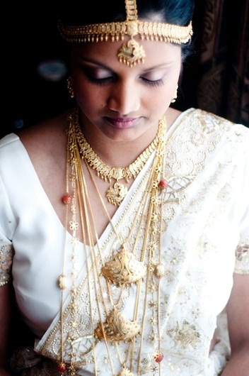 Ấn Độ và Sri Lanka, hai nước có nền văn hóa gần gũi, có một tục lệ bất thành văn là cô dâu trong ngày cưới phải ăn vận thật sang trọng và rực rỡ. Vẻ đẹp đó đến từ bộ trang sức bằng vàng đồ sộ mà cô dâu đeo lên người. Nào vòng cổ, vòng tay, khuyên tai, khuyên mũi, gài tóc… Họ trở thành những cô gái “dát vàng”.