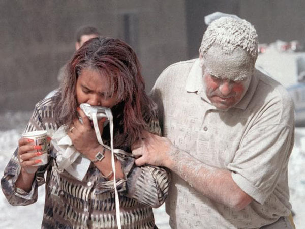 Một nạn nhân được dìu ra ra khỏi khu vực Tháp đôi sau vụ tấn công kinh hoàng. Ảnh: Alamy