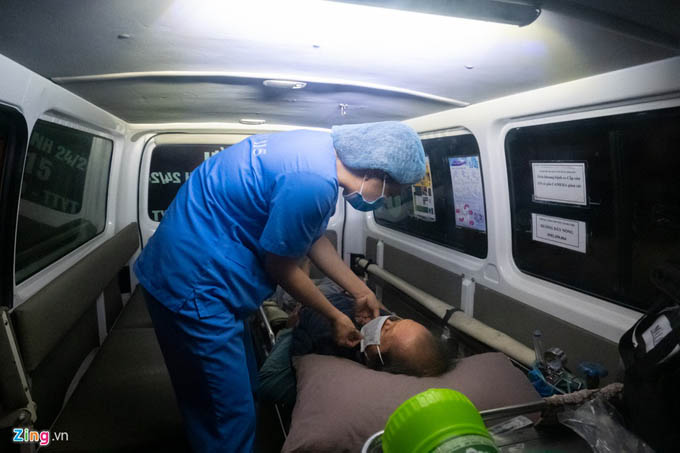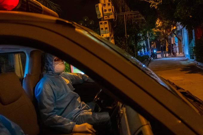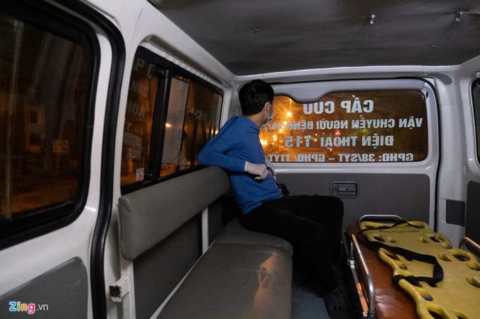 Người cách ly được đeo khẩu trang và găng tay trước khi lên xe. Với chuyến vận chuyển thường, bác sĩ và điều dưỡng luôn phải túc trực bên cạnh để theo dõi các dấu hiệu của người bệnh, còn với những chuyến đi như thế này, kíp trực và người nghi nhiễm được giữ khoảng cách tối đa có thể và không giao tiếp trên xe. Người đàn ông tiếp xúc gần với F0, xách một túi cá nhân, ngồi phía trong cùng của xe, ngoái đầu nhìn về con ngõ nhỏ.