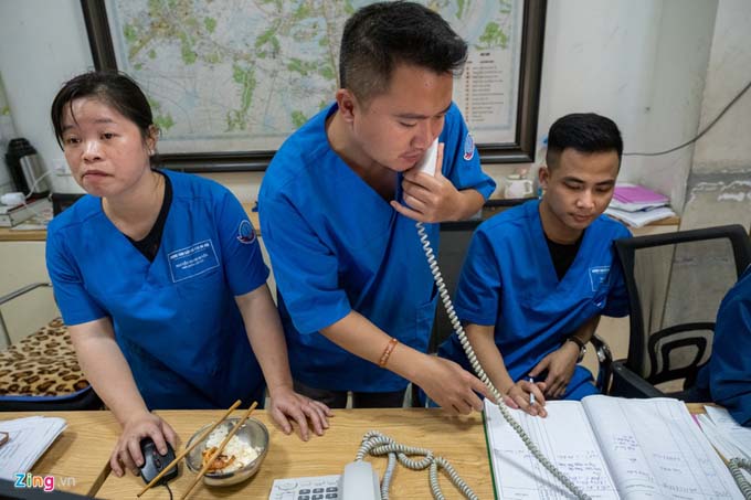 Bác sĩ Trần Anh Thắng, Phó giám đốc Trung tâm 115 Hà Nội, cho biết hiện mỗi ca trực có 15 xe, trong đó có 5 chiếc đặt tại trạm trung tâm. Mỗi kíp gồm một bác sĩ, một điều dưỡng và một lái xe. Một kíp có thể thực hiện 8-10 chuyến/ca trực. Tính trung bình mỗi chuyến kéo dài 2 tiếng thì việc thức trọn 24h là điều bình thường. Những chuyến đi có khi quá giờ giao ban (8h sáng mỗi ngày) nên việc hoàn tất một ca trực đến gần trưa hôm sau là việc thường xuyên diễn ra ở đây.