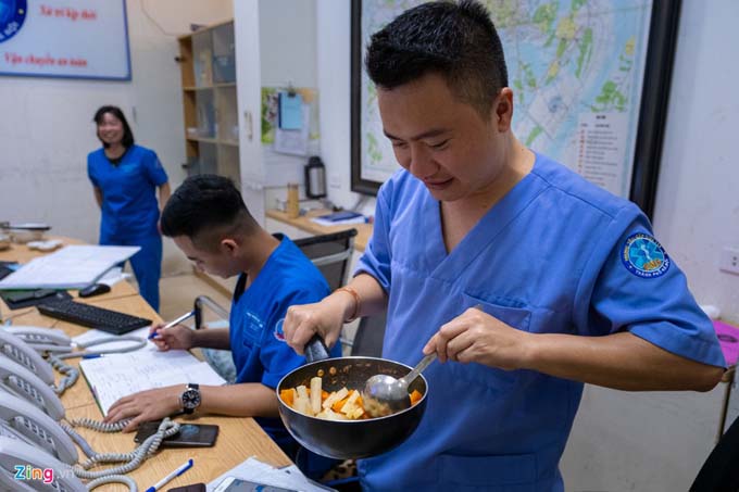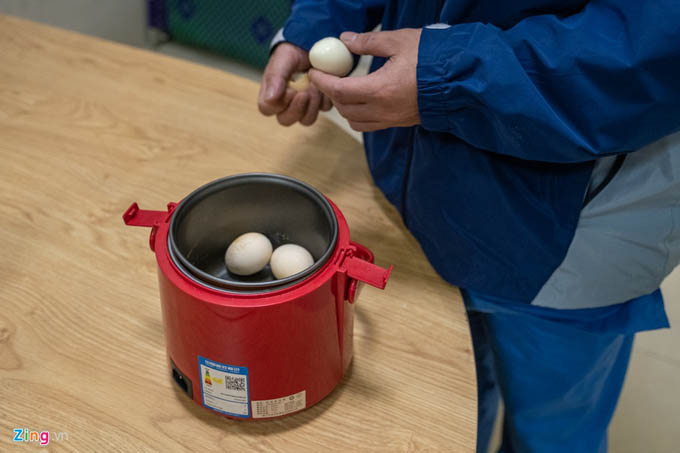 Cơm cũng được nấu ngay tại phòng để mọi người tranh thủ dùng bữa. Có lần bận rộn quá, nồi rau củ luộc xém cháy.