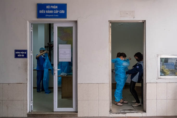 Khu vực dành cho nhân viên, nghe thấy tiếng chuông báo có ca cấp cứu, bác sĩ Hạnh đang sấy dở mái tóc lập tức tắt máy, điều dưỡng Liên B vừa ngả lưng xuống giường cũng bật dậy. Bên ngoài, lái xe Thành đã lăn bánh ra phía cửa. Thời gian tiếp nhận một ca nghi nhiễm Covid-19 mới ở tổng đài đến lúc ê-kíp trực sẵn sàng vào vị trí, tất cả chỉ diễn ra trong 5 phút.