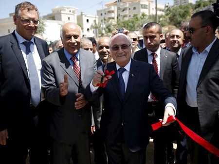 Chủ tịch Blatter (giữa) cùng hai Chủ tịch LĐBĐ Israel và Palestine (phải và trái) cắt băng khánh thành một làng thể thao tại TP Ramalah.