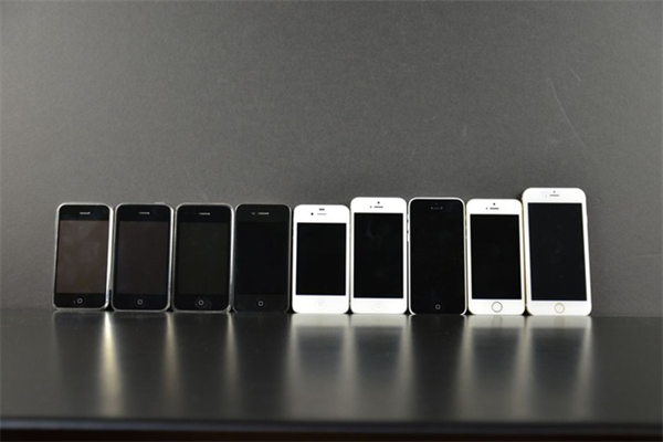 iPhone 6 được chờ đợi là mẫu có kích thước lớn nhất trong đại gia đình iPhone của Apple. Từ trái qua phải là iPhone 2007, tiếp đó là iPhone 3G, 3GS, 4, 4S. Apple mở rộng kích thước lên 4 inch từ iPhone 5, sau đó là 5C, 5S ra mắt năm ngoái.