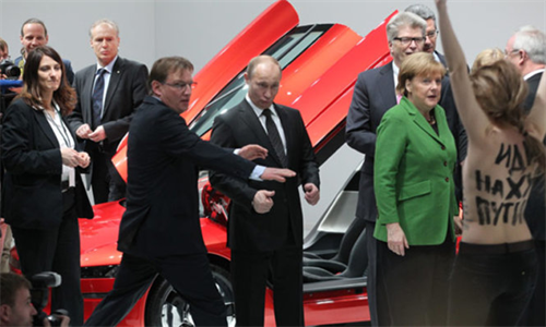 Vệ sĩ bảo vệ ông Putin và Thủ tướng Đức Angela Merkel khi nhóm biểu tình "ngực trần" FEMEN "tấn công"  ở Hannover trong một lần ông Putin đến thăm Đức - Ảnh: Getty Images