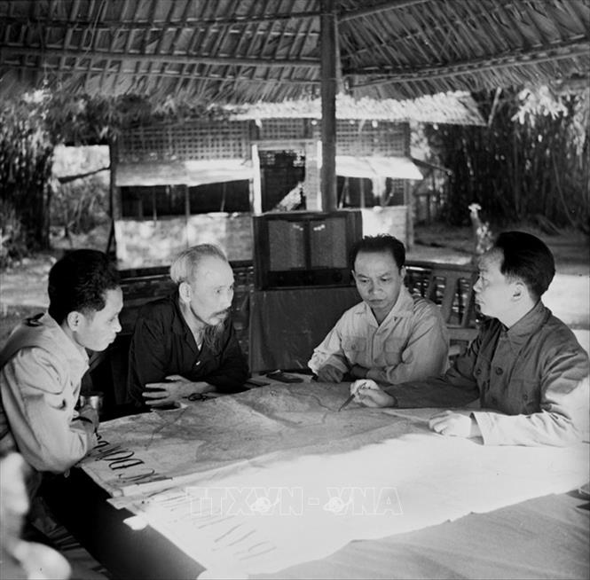 Chủ tịch Hồ Chí Minh, Đại tướng Võ Nguyên Giáp cùng các lãnh đạo Đảng và Nhà nước bàn kế hoạch mở chiến dịch Điện Biên phủ năm 1954 (Ảnh tư liệu TTXVN)