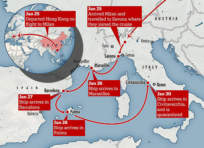 Nó bị cách ly ngoài khơi vào ngày cuối cùng của hành trình, khi chuẩn bị trở lại cảng Civilitavecchia. Trong khi đó, cặp vợ chồng Trung Quốc được cho là lên tàu tại Savona vào ngày 25/1. Họ đã bay từ Hong Kong đến sân bay quốc tế của Milan vào cùng ngày.