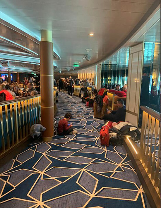 Các hành khách chờ đợi bên trong tàu Costa Smeralda. Ảnh: Twitter.