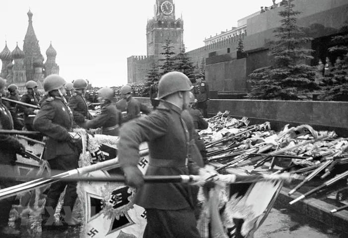 Cờ của quân đội Đức Quốc xã bị ném xuống chân tường thành Điện Kremlin trên Quảng trường Đỏ ở Thủ đô Moskva tại Lễ duyệt binh chào mừng Ngày Chiến thắng, ngày 24/6/1945. (Ảnh: Tư liệu quốc tế/TTXVN phát)
