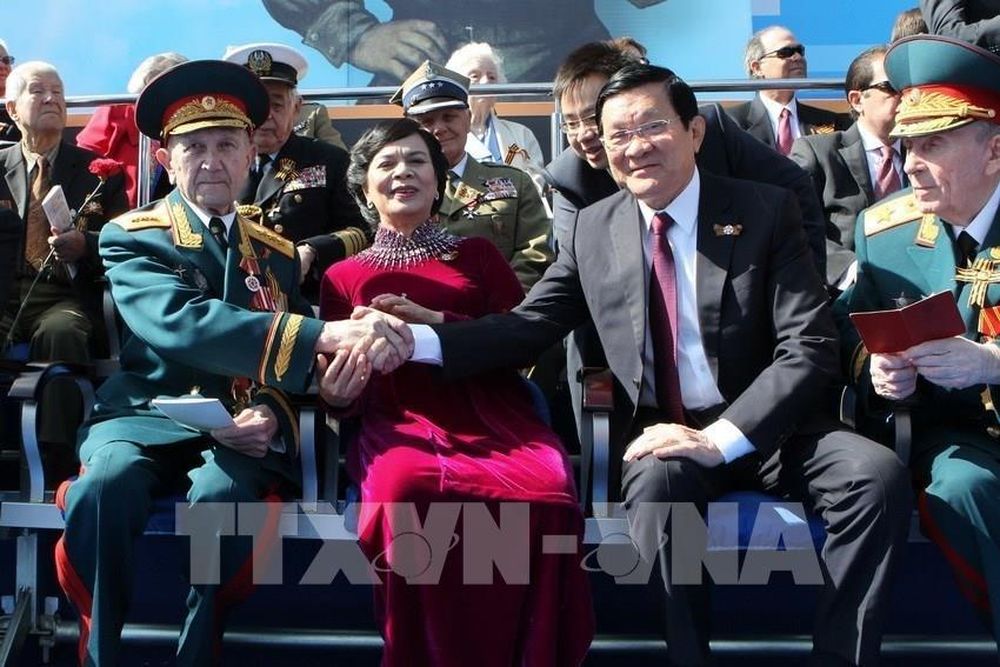 Chủ tịch nước Trương Tấn Sang và Phu nhân với cựu chiến binh Nga trên khán đài dự Lễ kỷ niệm 70 năm Chiến thắng trong Chiến tranh Vệ quốc vĩ đại (Nga, 9/5/2015). Ảnh: Nguyễn Khang – TTXVN