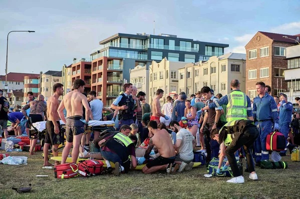 Các nhân viên dịch vụ khẩn cấp vận chuyển người bị thương trong vụ xả súng tại bãi biển Bondi ở Sydney, Australia. © Getty Images / Sydney Morning Herald/Flavio Brancaleone.
