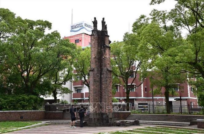 Một dấu tích sót lại của nhà thờ Urakami bị đánh sập trong vụ ném bom ngày 9/8 được đặt trong Công viên hòa bình của Nagasaki ngày nay. Ảnh: Nguyễn Tuyến/PV TTXVN tại Nhật Bản
