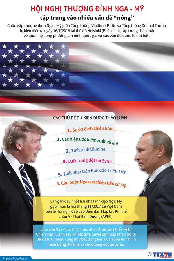 Theo Tổng thống Trump, ông sẽ thảo luận với người đồng cấp Nga và tình hình ở Syria và Ukraine. Trước đó, có thông tin cho rằng Tổng thống Trump muốn gặp riêng Tổng thống Putin, không có mặt của bất kỳ ai khác. Tuy nhiên, 8 nghị sĩ Dân chủ tại Thượng viện đã viết thư đề nghị Tổng thống Trump không gặp riêng ông Putin.