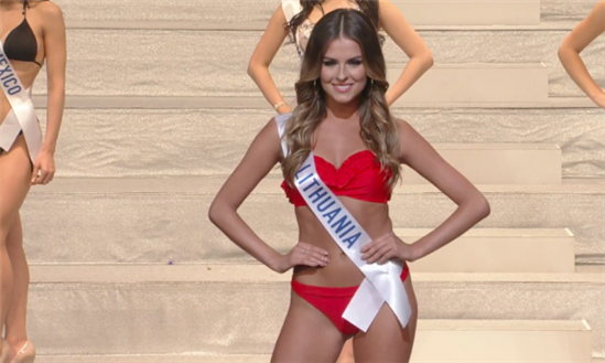Với bikini màu cam đỏ nổi bật, phần trình diễn của hoa hậu Lithuania nhận được rất nhiều tiếng vỗ tay ủng hộ của khán giả.