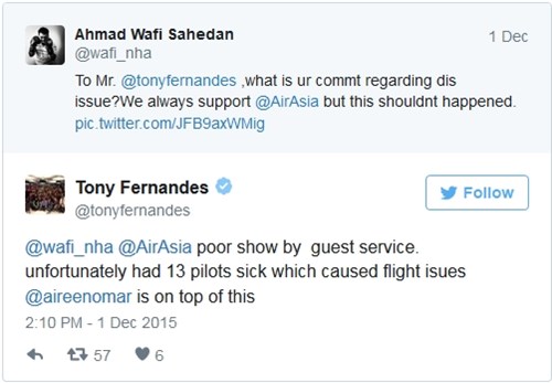 Trên trang Twitter của hãng, một hành khách phàn nàn: "Chuyến bay có số hiệu AK 6323 từ đảo Langkawi tới Kuala Lumpur của tôi đã bị hoãn từ 15h15 tới 20h47 và sau đó bị huỷ mà chưa nhận được thông báo tiếp theo. Thật đáng xấu hổ cho một hãng hàng không."